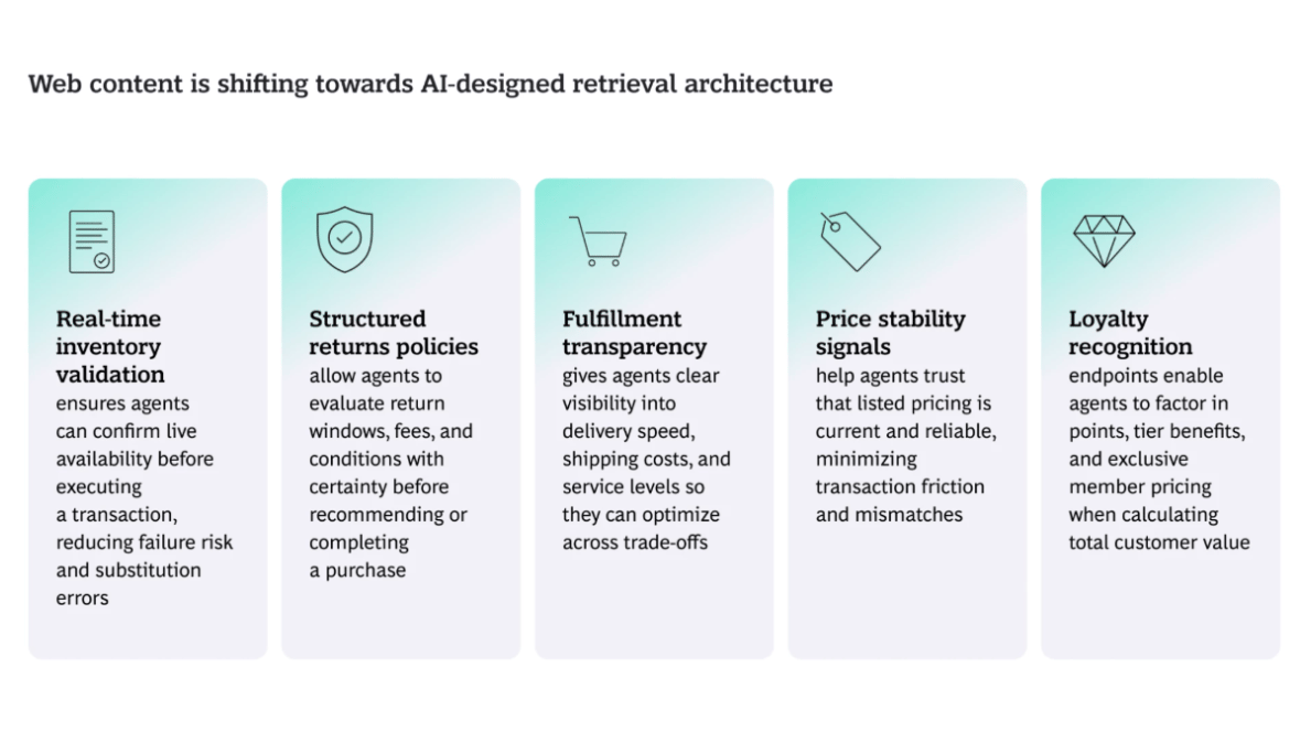Winning brands will prioritise clear entities, stable schemas, trusted feeds, machine-readable content, and agentic transactions (image above).