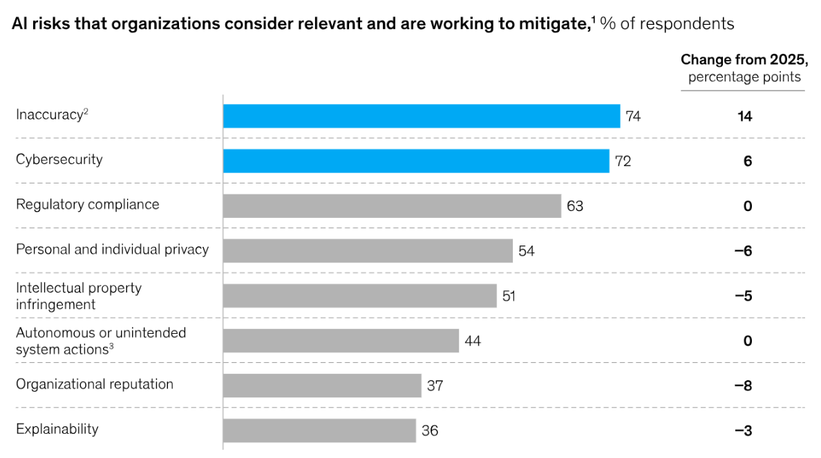 As AI adoption grows, 74% of firms identify inaccuracy and 72% cite cybersecurity as highly relevant risks (image above).