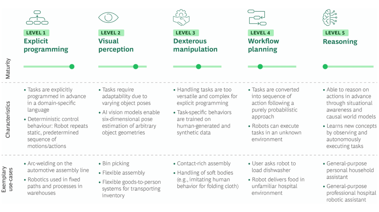 BCG proposes a five-level physical AI framework clarifying what robotic systems can do today, near-term readiness, and long-term bets.