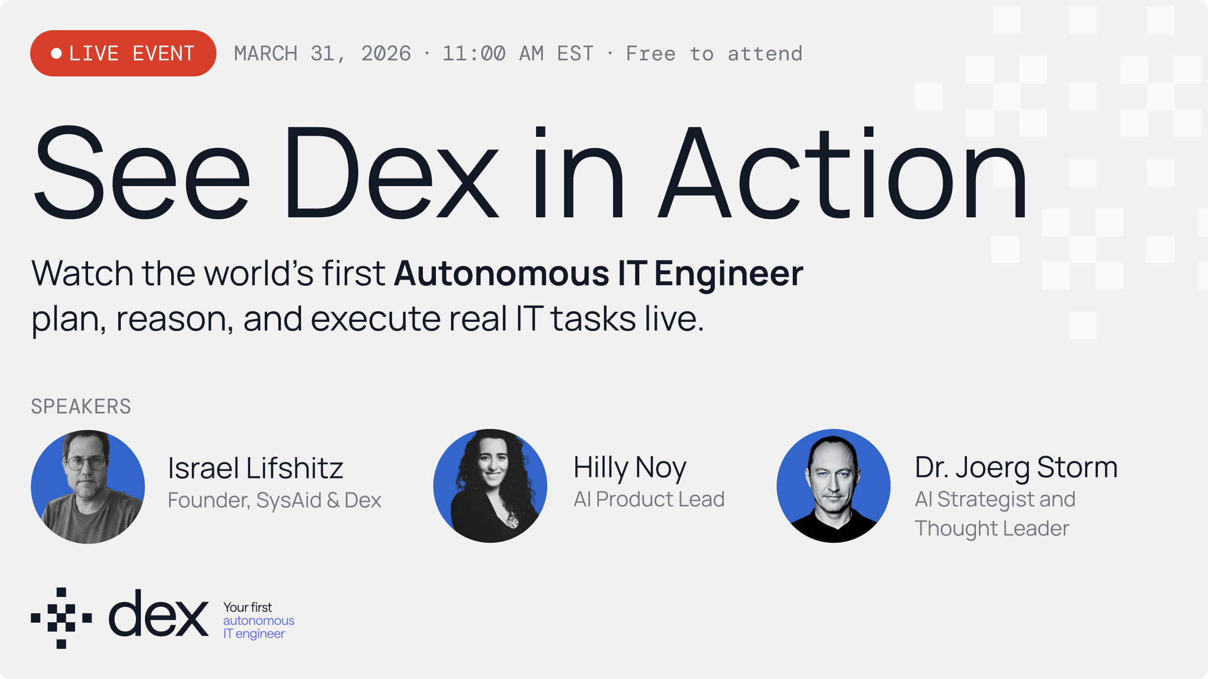 See the first public demonstration of Dex on March 31.