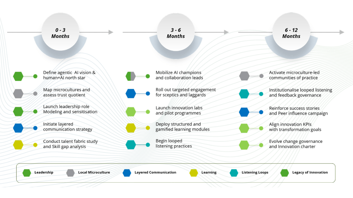 These pillars are activated across transformation stages, guiding organisations through adoption and scale-up (image above).
