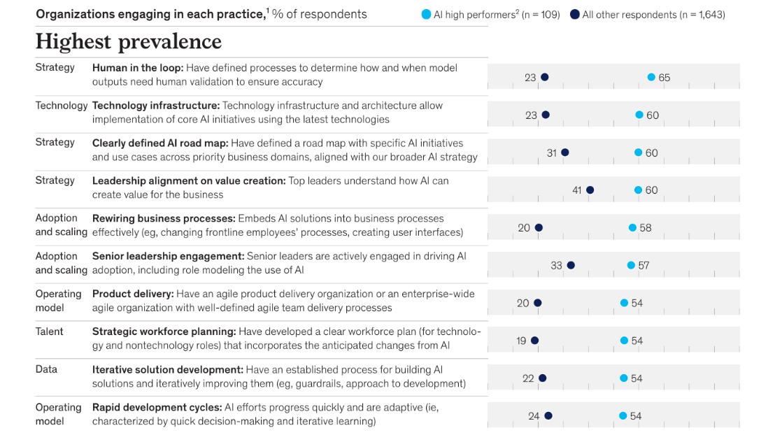 High-performing firms employ best practices like structured Human-in-the-Loop (HITL) validation and rewiring processes (image above).