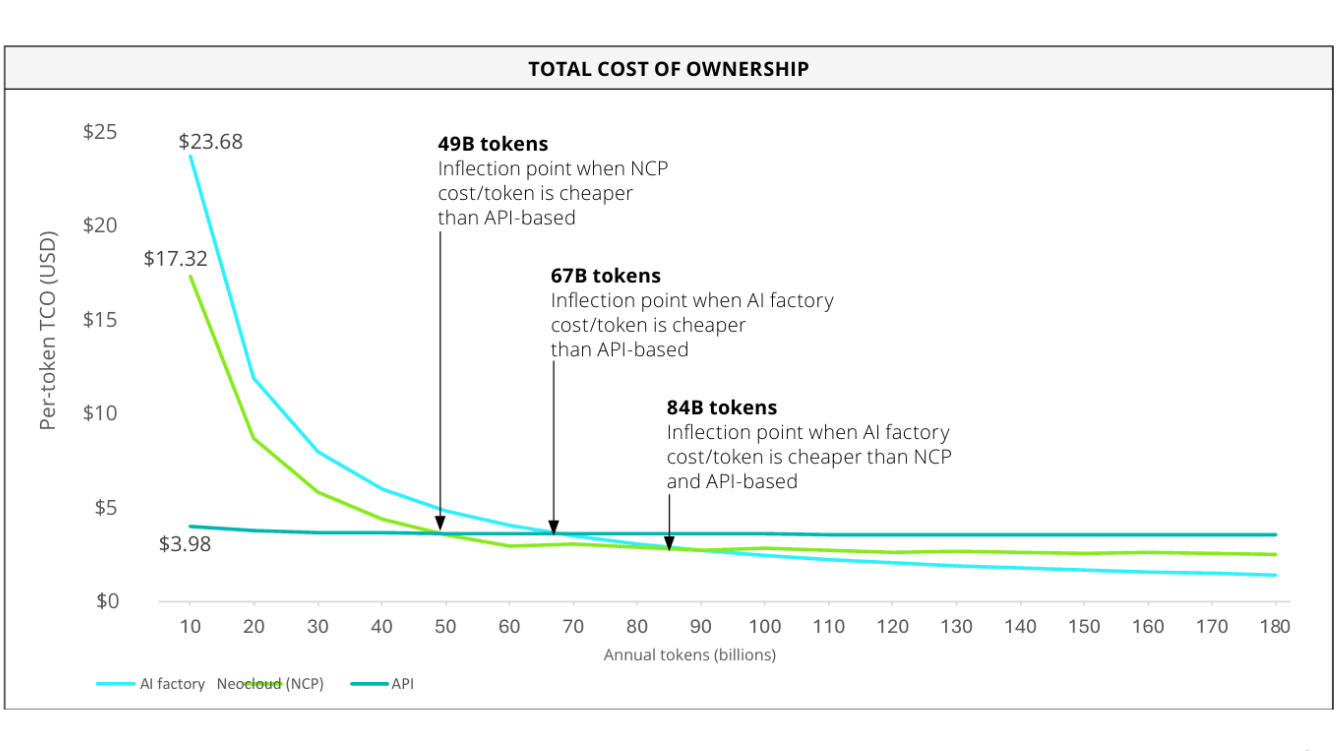 At 84B+ tokens annually, AI factories offer the lowest TCO. API costs scale linearly, while Neocloud hinges on GPU use (image above).