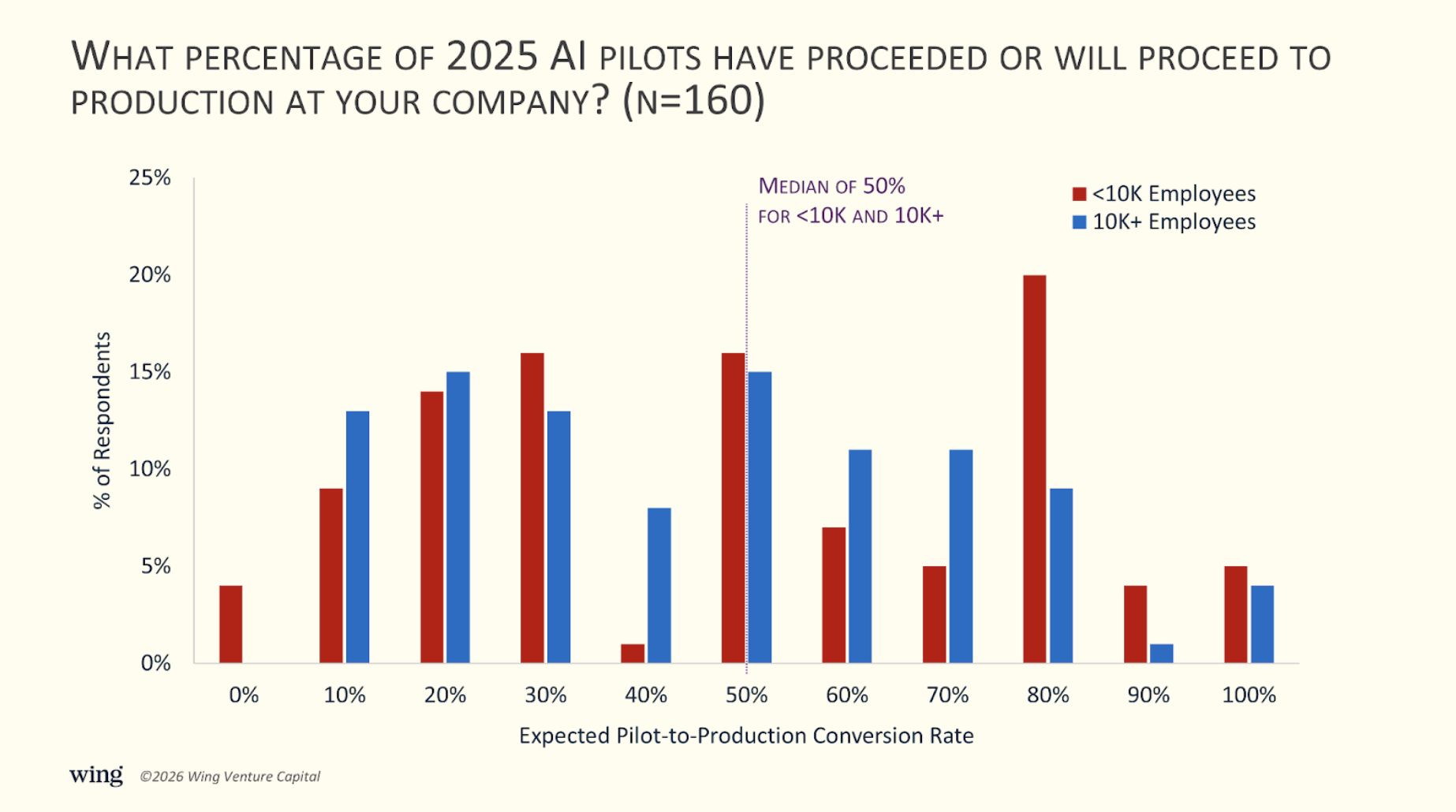 Among large enterprises, a median 50% expect AI pilots to reach production, with 41% at 10–30% and 38% forecasting 50–70%.