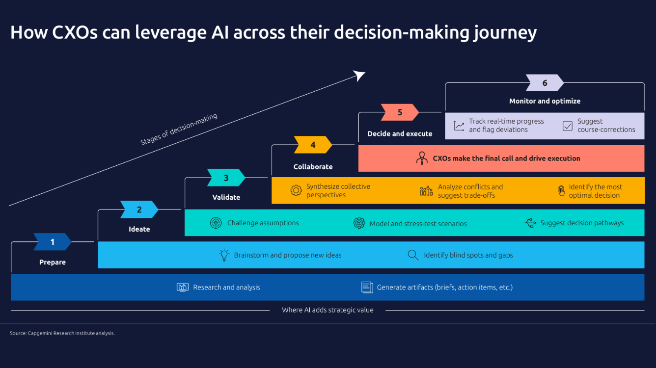 Brief: Capgemini Research Institute examined how CXOs integrate AI into strategic decision-making, drawing on a survey of 500 CXOs, including 100 CEOs, alongside in-depth interviews.